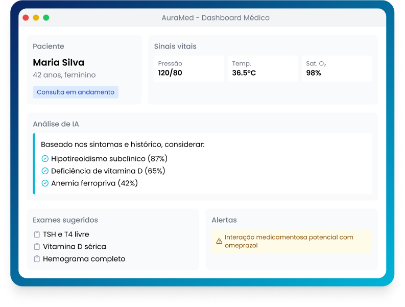 Visualize em tempo real um dashboard com a linha de tempo clínica do paciente, análise contínua de sintomas, sinais de alerta e insights clínicos gerados pela IA.